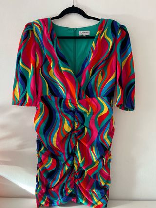 Vestido de fiesta con un vibrante estampado. Este lo compré durante las vacaciones en Málaga en una pequeña boutique con vestidos únicos. Apenas usado. 95% poliéster y 5% elastano. - Diseño con escote pronunciado. - Mangas abullonadas. - Detalle de fruncido en la falda. - Largo hasta la rodilla.