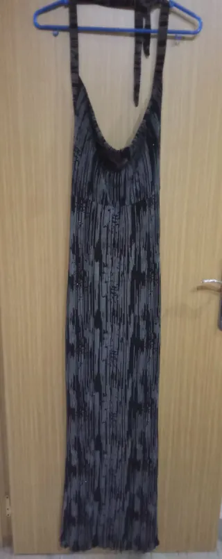Elegante vestido largo de fiesta. - Diseño de cuello halter. - Tejido vaporoso y fluido. - Corte maxi. - Todo el vestido esta forrado. - Cremallera en espalda. -Al ser ancho vale también para un tallaje 38. -Talla 36