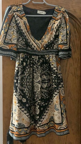 vestido estampado de poliéster y elastano, con tirantes anchos,escote redondo terminado en pico, cremallera invisible en el lateral izquierdo, forrado, bajo el pecho, lleva un fajín amarillo que se cierra atrás mediante un nudo o un lazo, tela muy suave con mucha caída, tiene tres volantes, los cuales hacen que disimule todo muy bien la medida del fajín es de 43 cm en la parte del pecho, puede dar unos centímetros más largo desde el tirante 1,10 m talla 44