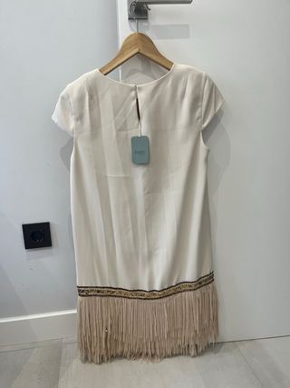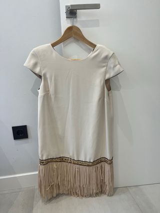 Vestido de fiesta. Color crema. Detalle de lentejuelas y flecos en la parte inferior. Marca Hoss Intropia. Talla 38