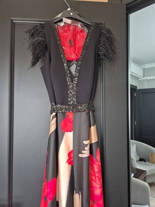 Precioso vestido de fiesta largo de la marca Nelly Ferreiro, talla M (38-10). El vestido es de color negro y rojo, con estampado floral. Luce impecable, con etiqueta, nuevo, sin estrenar. - Escote en pico - Detalle de plumas en los hombros - Falda con abertura lateral - Cintura ceñida