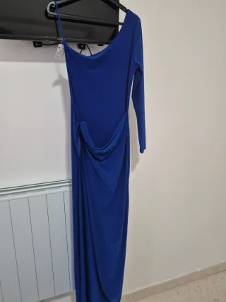 Precioso vestido azul para ocasiones especiales. Es de talla M y tiene un diseño elegante y favorecedor. - Escote asimétrico. - Detalle de pedrería en la cintura. - Tejido ligero y fluido. - Perfecto para eventos nocturnos.