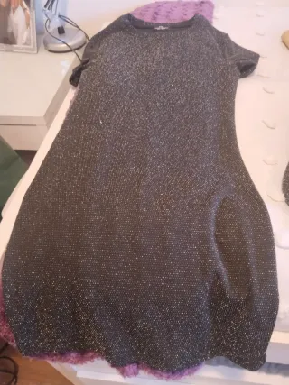 Prendas nuevas sin estrenar para fiestas: - Juvenil cuerpo elástico sin tirantes de lentejuelas negras.Marca TRF,M.Medidas: 35x35 cm.Precio 10 euros. - Falda plisada plateada largo medio. Cintura elástica y pañuelo largo a juego. Talla M.Medidas 45x55 cm.Precio 8 euros. - Original vestido de punto plisado gris oscuro plateado. Cuello redondeado y hombros descubiertos.Marca Ada Gatti. Medidas 45x105 cm.Precio 20 euros. - Elegante jersey manga larga de tul bordado en terciopelo negro. Marca Free Quent XL.Medidas 54x67cm.Precio 30 euros. - Jersey manga larga en punto fino de oro viejo.Síntesis XXL.Medidas 50x75. Precio 25 euros.