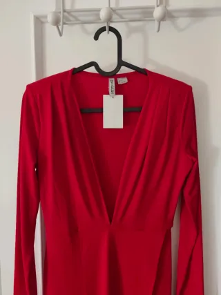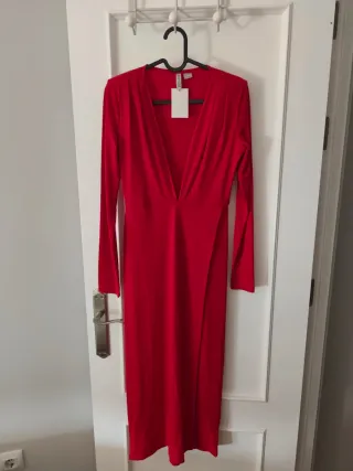 Vestido largo de fiesta en color rojo, ideal para eventos especiales. Diseño elegante con escote pronunciado y abertura lateral. - Manga larga. - Corte ceñido. - Largo midi.