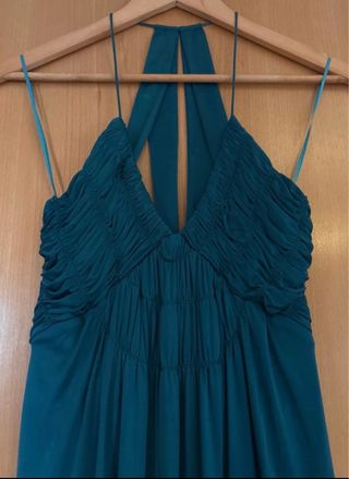 Vestido de fiesta azul petróleo con espalda descubierta, talla S. Marca Mango Suit.