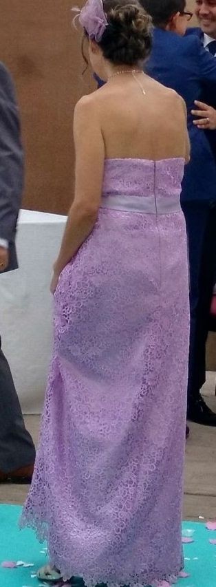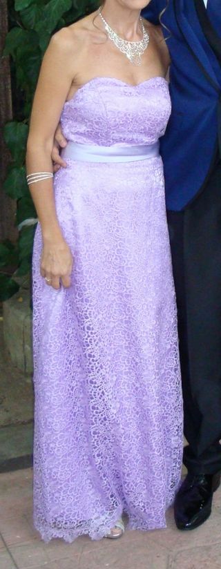 De la Rosa Azul."Bonito vestido para cualquier acontecimiento. sencillo y elegante.un solo uso. color lila. muy cómodo. talla36_38. contorno pecho 83-84cm.contorno cintura 72_73cm. largo desde arriba pecho 129-130cm.funda de transporte (su precio fue250€) dale una segunda oportunidad por menos de la mitad.