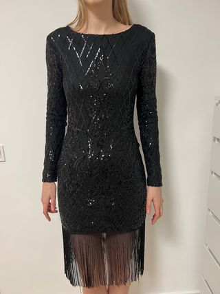 Vestido negro de fiesta con lentejuelas y flecos