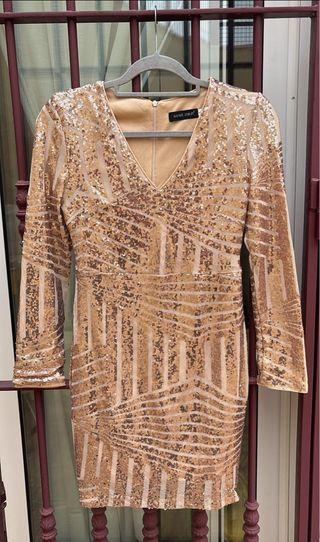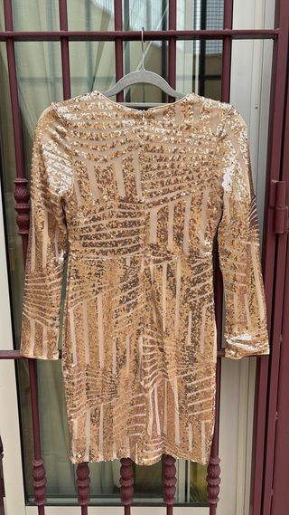 ¡Liquidación de armario! Vendo este espectacular vestido de fiesta de la marca Miss Ord. Es una prenda que llama la atención por su brillo y su diseño geométrico de lentejuelas doradas. Usado solo una vez, está impecable. ✅ Detalles del producto: Marca: Miss Ord. Estado: Como nuevo, puesto solo en una ocasión. Talla: S. Diseño: Escote en V muy favorecedor, manga larga y cierre con cremallera invisible en la espalda. Estilo: Ajustado al cuerpo con un patrón de lentejuelas estilo "art déco" que hace tipazo. ✨ Ideal para bodas, eventos, fiestas o cualquier ocasión donde quieras destacar. ¡Es una joya! 💰 Precio: 17€ 🚚 ENVÍO GRATIS