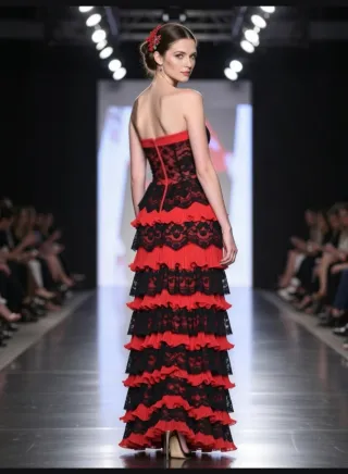 .Precioso vestido largo de Brasilia. Negro y Rojo. Volantes de tela encaje en negro y plisada lisa en rojo. Solo utilizado para una boda. Cierre en espalda con cremallera. Espectacular. Su precio original 150 euros. Medidas pecho 40, cintura 35, largo 130 .Ver detalles del vestido en las fotos. - Diseño strapless.