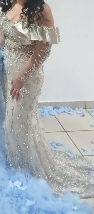 vestido de boda gitana beis con pedrería y cola talla S-M - Diseño con escote Bardot. - Adornado con pedrería y abalorios. - Corte sirena con abertura. - Mangas acampanadas.est