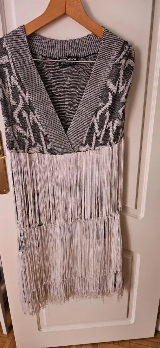Vestido estilo años 20 con un diseño inspirado en el Charlestón. La parte superior presenta un estampado geométrico en contraste y la falda está adornada con múltiples capas de flecos que aportan mucho movimiento. - Diseño sin mangas. - Escote en V pronunciado. - Flecos largos en cascada. Vestido de fiesta Charlestón años 20 Este estupendo traje está en muy buenas condiciones. Usado una o dos veces. Los flecos están impecables. Si quieres disfrazarte de años 20 o de chalestón o si quieres ir a un evento con un vestido elegante, esta es tu mejor elección.