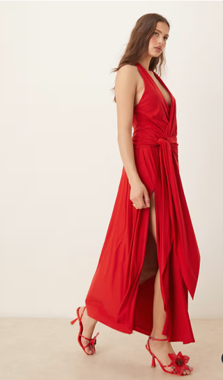 Vestido largo rojo con cuello halter y detalle anudado en la parte delantera de punto liso de Abercrombie & Fitch. Talla 36 (XS). Solo puesto una vez, está impecable. Precio original 130€