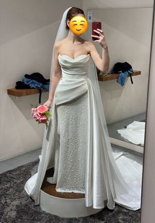 Incluye: ✨ Vestido exterior (ceremonia) Sobrefalda estructurada de satén con caída espectacular. Aporta un look clásico, sofisticado y muy elegante. Tiene cola recogible para bailar. ✨ Vestido interior (fiesta) Vestido palabra de honor completamente cubierto de pedrería y bordados, muy luminoso y especial. Puede llevarse solo tras retirar la capa exterior. También cuenta con cola recogible, muy cómodo para la celebración. ✨ 2 velos con detalles de perlas – Velo largo con caída impresionante – Velo corto para ceremonia. Ambos con peineta incorporada, fáciles de poner y quitar. Talla: 36 (S). Altura: 1,76 m. ➡️ El vestido es muy largo