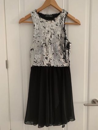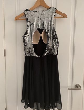 De muy poco uso, es un vestido corto de lentejuelas en cuya falda hay un pequeño volante, tiene la espalda al aire y lleva cascos como se ve en la fotografía.