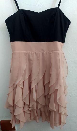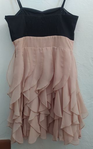 Vestido de tirantes, con cremallera invisible. Queda ajustado en la cintura y volantes rosas palo.