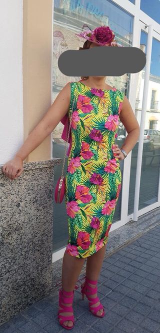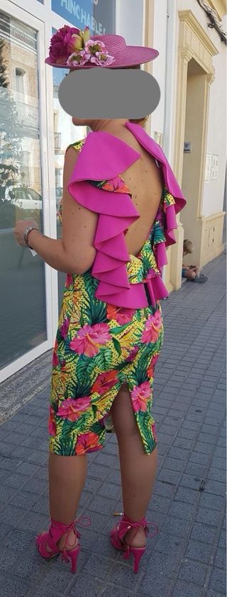 Vestido boda, estampado floral con colores atrevidos, rosa fuxia/bugambilla, amarillo,con espalda descubierta con un volante trasero.Ajustado ya que es un poco elastico pero de tela recia material q estiliza muchisimo.SOLO UN USO
