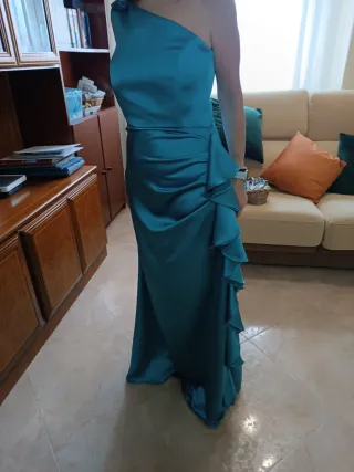Vestido elegante de corte midi, ideal para eventos especiales. - Diseño asimétrico con un hombro. - Detalle de volantes XL en el hombro. - Manga larga. - Tejido con caída. Solo se ha usado en una ocasión.