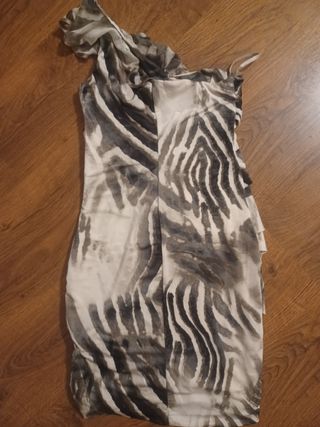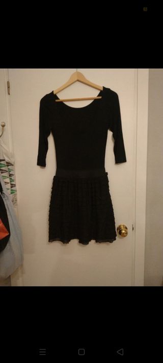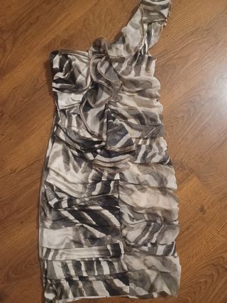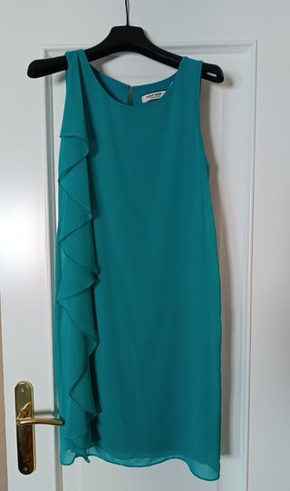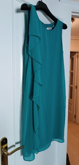 Vestido nuevo, sin estrenar. Talla 34. Queda suelto, justo por encima de la rodilla y tiene un volante en el lado derecho que va desde el hombro hasta el final del vestido. Precio original 55€.