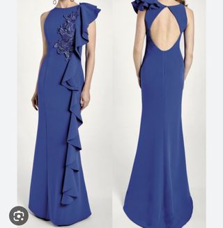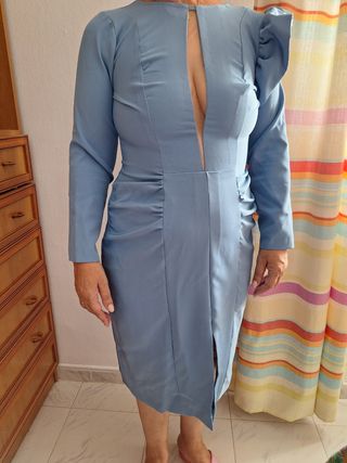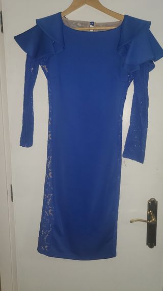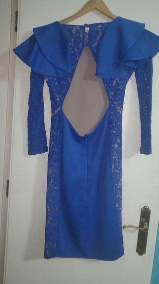 Vestido azul de fiesta, con volantes en los hombros y encaje en las mangas. Tiene media espalda al aire y el cierre de arriba con tres botones el encaje de los laterales cuenta con una "falda" color nude debajo del vestido para que no se trasnparente. Es una talla S grande casi una M(38).