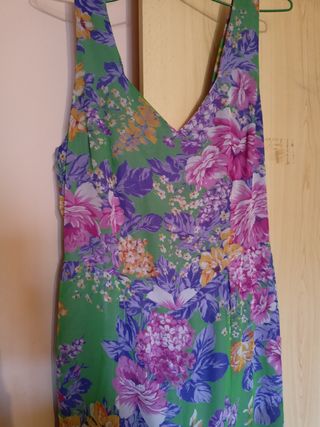 Vestido de fiesta con un bonito estampado floral. - Diseño asimétrico con volantes en la espalda. - Tejido satinado brillante. Solo usado un par de veces. Se entrega en Sevilla capital. Chal de regalo.