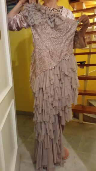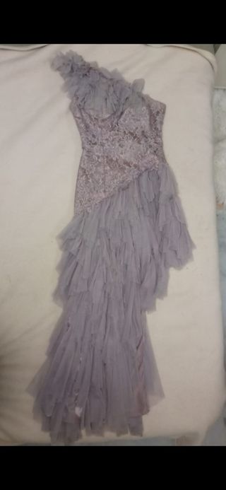 👗Puesto en dos ocasiones. Costó 490€. Asimétrico, con volantes de gasa. Entallado, con bordados y pedrería. Color lila. Talla 34 ó 36. Queda precioso. Muy favorecedor, festivo y elegante.