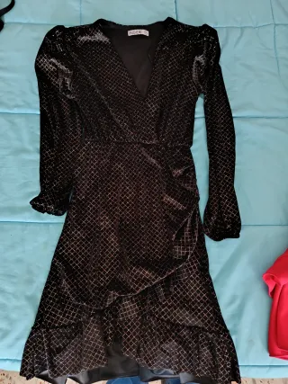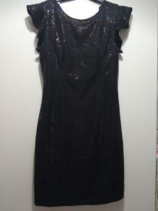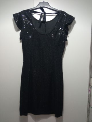 bonito y elegante vestido negro con brillos manga corta con volante,ideal para eventos o para lo que quieras color negro.talla 38 ,sobre las rodillas muy buen estado está forrado ,lazo en la espalda de raso k puedes meterlo para dentro del vestido y no se ve.