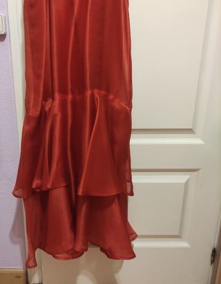 Vestido de raso, forrado, con volante inferior largo desigual.