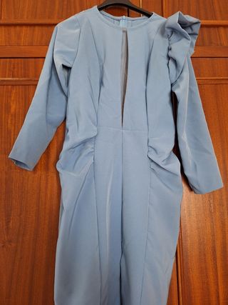 Mono largo de invitada/fiesta, solo tiene una puesta. Es de pata recta, escote en la espalda con un volante de adorno. Tiene dos presillas a los laterales para poder colocar un cinturón, esa zona está un pelín rozada (fotos 6-8) no se nota apenas y si se pone con cinturón lo tapa completamente.