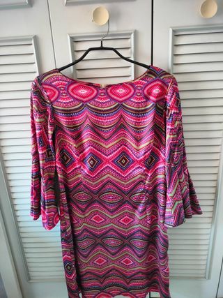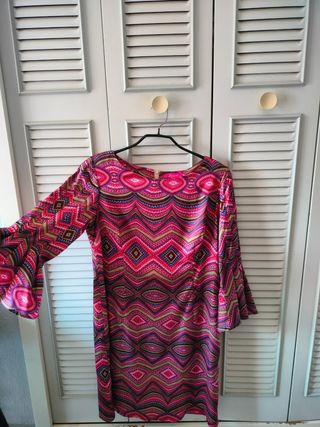 Precioso vestido de fiesta con estampado multicolor para una fiesta o ceremonia La manga termina en volante, es preciosa. - Corte recto - Escote redondo Con forro - Cierre con cremallera invisible en la espalda