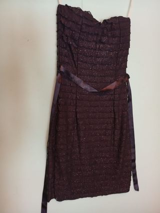 Vestido de fiesta color lila cosido con hilo plateado que crea un efecto algo brillante muy bonito. Largo por encima de la rodilla. Escote asimétrico con volante decorativo que pasa por encima del hombro. Puesto una vez.