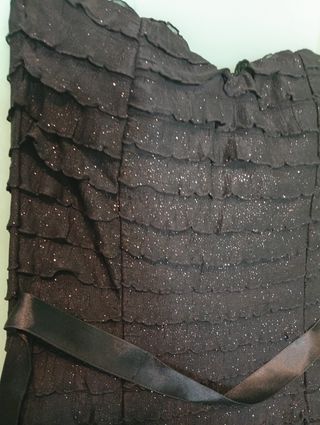 Vestido de fiesta sin tirantes con un diseño elegante y detalles brillantes. Perfecto para ocasiones especiales. - Diseño con volantes. - Cinturón de satén. - Tejido con acabado brillante.