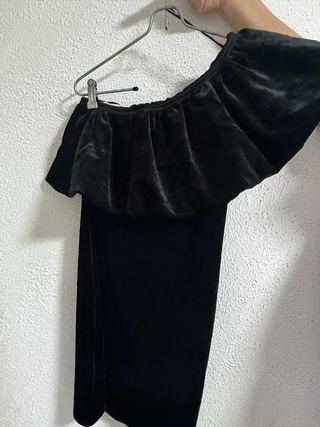 Vestido de fiesta elegante, ideal para ocasiones especiales. - Diseño de terciopelo. - Corte asimétrico. - Detalle de volantes.