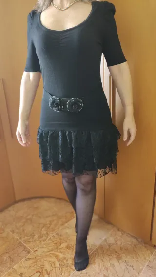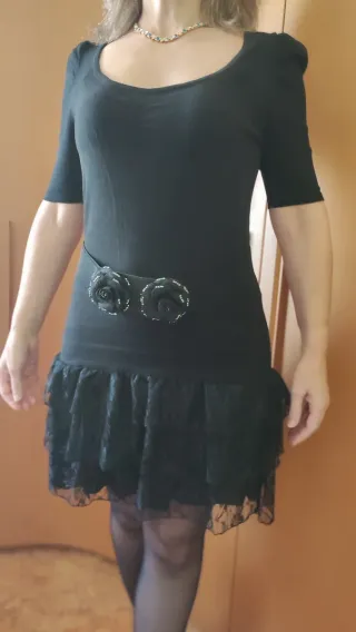 Vestido de media manga sin cremallera y con encajes florales en el volante de la marca BLANCO. - Pone talla S pero sirve para una M. - Falda baja, minifalda. - Incluye cinturón. Sin cinturón lo dejo en 8 € - Por su bonito volante sirve para fiesta. - Volantes en cascada.
