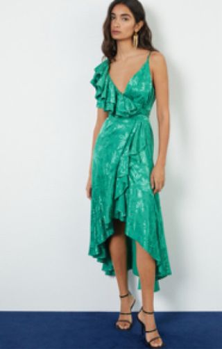 Vestido de fiesta en color verde. Con volantes en la parte superior y falda fluida. - Escote en V. - Mangas tipo volante. - Falda midi. - Un solo uso.