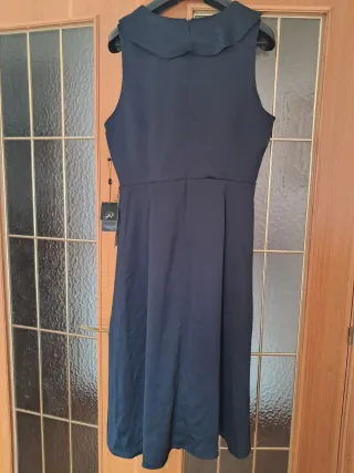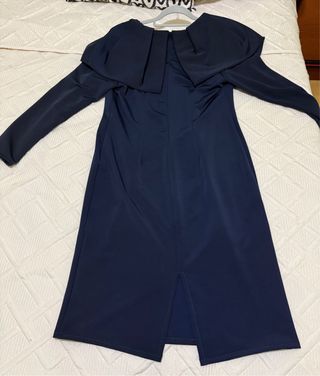 Elegante vestido largo de fiesta, ideal para invitadas. Color azul marino. Diseño con cuello halter, abertura en la espalda. Me costó 120 euros. Utilizado solo en una ocasión, está NUEVO. Talla 36. - Detalle de fruncido en la cintura. - Falda con caída asimétrica y volantes.