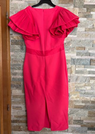 Vestido elegante de la marca MissSidecar para fiesta / ceremonia / evento. Color: fucsia Talla: L Largo: por la rodilla - Diseño con cuello halter. - Volante en bajo. - Detalle de lazo en los hombros. - Abertura en la espalda.