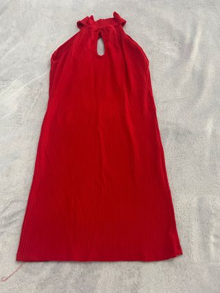 Precioso vestido rojo para ocasiones especiales. Es de un tejido ligero y fluido, ideal para el verano. - Escote redondo. - Sin mangas, con volantes en los hombros. - Bajo con vuelo. - Cierre con cremallera invisible en la espalda.