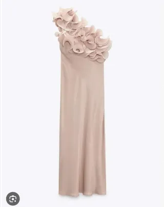 Precioso vestido largo para ocasiones especiales. Ideal para una boda o evento formal. - Diseño elegante y sofisticado. - Confeccionado en un tejido brillante. - Detalle de volantes en la parte superior y lateral. - Un solo tirante.