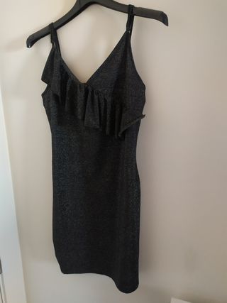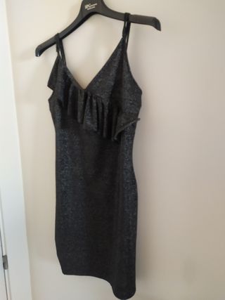 Usado solo una vez, en perfecto estado Vestido negro con brillos en plateado. Asimétrico y corto, tiene como un volante en el tirante hasta abajo. Super cómodo y ligero. Ideal para fin de año o para salir de noche. Es una talla S pero yo uso la M y me vale perfectamente sin quedar apretado. Largo del vestido desde el tirante 82 cm. La etiqueta del material y lavado la corte, pero es fluido y elástico. Si tienes dudas preguntame sin compromiso #vestidoañonuevo #vestidococtail #vestidonochevieja #nochevieja