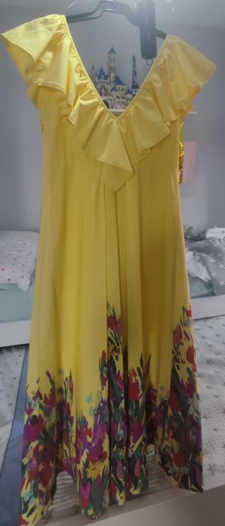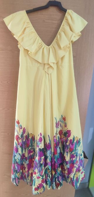 Precioso vestido de fiesta, ideal para cualquier ocasión. Es de color amarillo con un estampado floral en la parte inferior. - Diseño favorecedor con vuelo. - Escote en pico con volantes. - Manga corta.