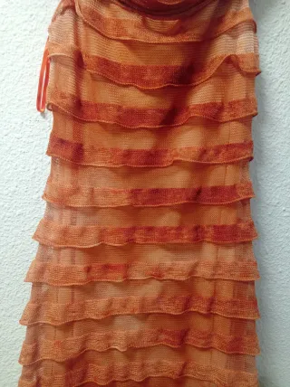 Vestido de fiesta con un diseño de volantes escalonados. - Tejido de punto muy finito con detalles en diferentes tonos tostados. - Lleva forro para no transparentar -Es de tirantes para debajo del hombro. Largo total del vestido 115 cm