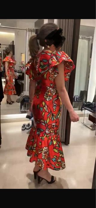 Vestido con un vibrante estampado floral, ideal para bodas, fiestas o ferias. - Diseño con mangas abullonadas. - Corte sirena con volante en el bajo. - Escote en la espalda.