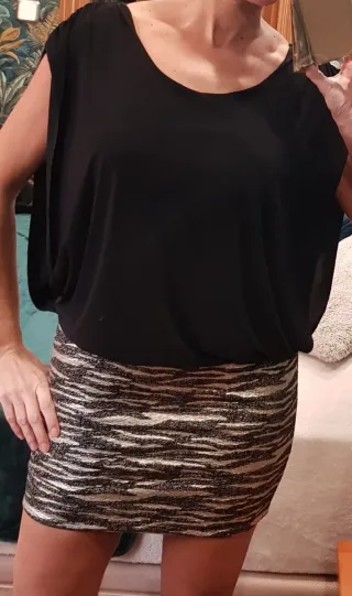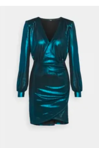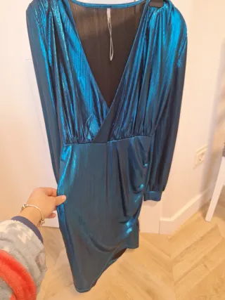 Vestido de fiesta marca Only con un llamativo acabado metalizado. Es elástico y hace tipazo, para una talla 36/38va perfecto, para una 40 tambien pero mas ceñido pero seguro cede porque es elástico. Comprado en Zalando y sin estrenar. Es una pasada de vestido, ver sin compromiso. - Diseño cruzado. - Manga larga abullonada. - Detalle fruncido en la cintura. - Falda con abertura. - Largo mini.