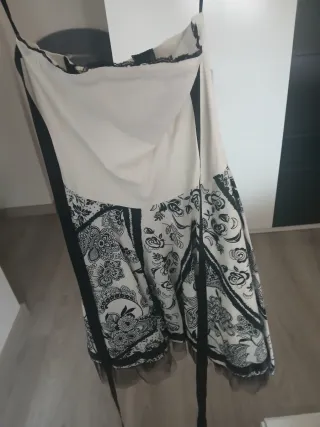 Vestido de fiesta corto con un diseño de palabra de honor y detalles de tul. - Estampado floral en blanco y negro. - Cinta de raso para entrelazar el pecho,m también se puede atar a la cintura con una lazada.
