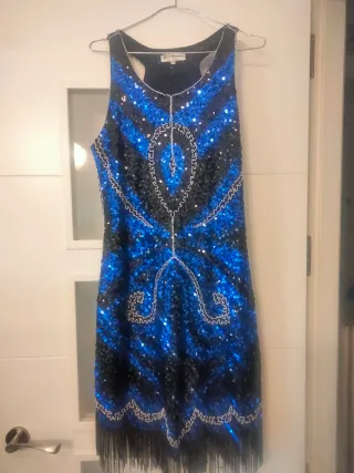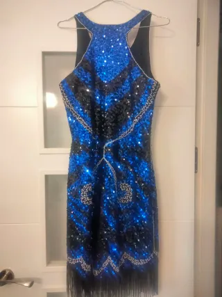 Vestido de fiesta con un diseño llamativo y elegante. - Cubierto de lentejuelas brillantes en tonos azules y negros. - Flecos en el bajo para un toque de movimiento. - Diseño sin mangas con escote redondo.