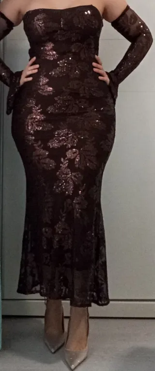 Vestido largo de lentejuelas con abertura lateral. - Diseño de escote corazón. - Mangas abullonadas. - Corsé transparente. Sin uso ninguno nuevo a estrenar