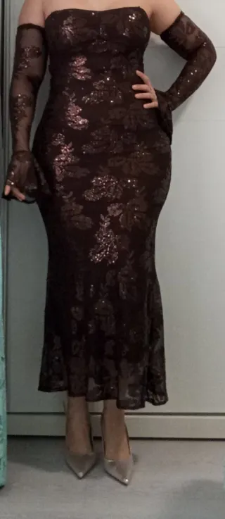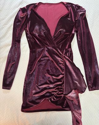 Elegante vestido de fiesta en color burdeos. Ideal para ocasiones especiales. Talla s usado una vez - Diseño con manga larga. - Detalle de tejido de red en la parte superior y mangas. - Corte ajustado que realza la figura.