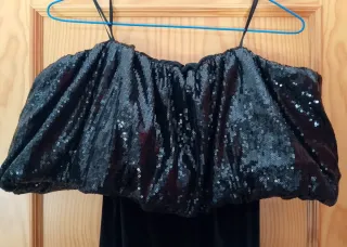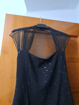 Elegante vestido negro, perfecto para eventos especiales. Su diseño con lentejuelas le da un toque brillante y sofisticado. - Escote halter con detalle de tul. - Falda asimétrica con vuelo. - Adornado con pequeñas lentejuelas. - Cierre de cremallera lateral. Pone talla 38 pero yo lo considero 36