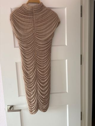 Vestido de fiesta largo y muy elegante, con un bonito color champán que aporta sofisticación. - Diseño fluido y vaporoso. - Tejido satinado con brillo. - Escote drapeado y ablusado.
