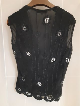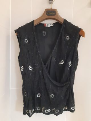 Precioso cuerpo de fiesta con un diseño elegante y detalles bordados. - Diseño cruzado. - Escote en V. - Sin mangas. - Adornado con pedrería y bordados florales. - Acabado festoneado en el bajo.